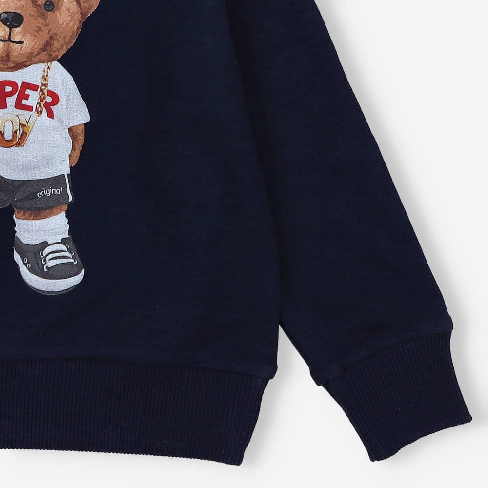 Суичър за момче с щампа на плюшено мече отпред. Изработена от приятен на допир памук с еластан. Висококачественият памук и рипсените гарнитури на ръкавите и деколтето са допълнителни предимства на дрехата. Суичър произведен в Полша.