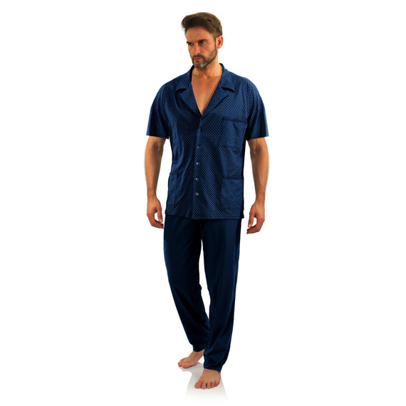 Изключително удобни и меки пижами Sesto Senso от две части са идеален избор за мъже, които ценят небрежния стил, но и класическия стил. Горнище с цип и модерен анкерен десен, къси ръкави, яка и три джоба. Дълги, свободни, гладки панталони с еластична регулируема талия за перфектно прилягане и максимален комфорт. Изработен от висококачествен, дишащ памук. Перфектен за всеки сезон. Опакован в оригинална, естетична опаковка, което го прави подходящ и за подарък. Продукт произведен в Полша.