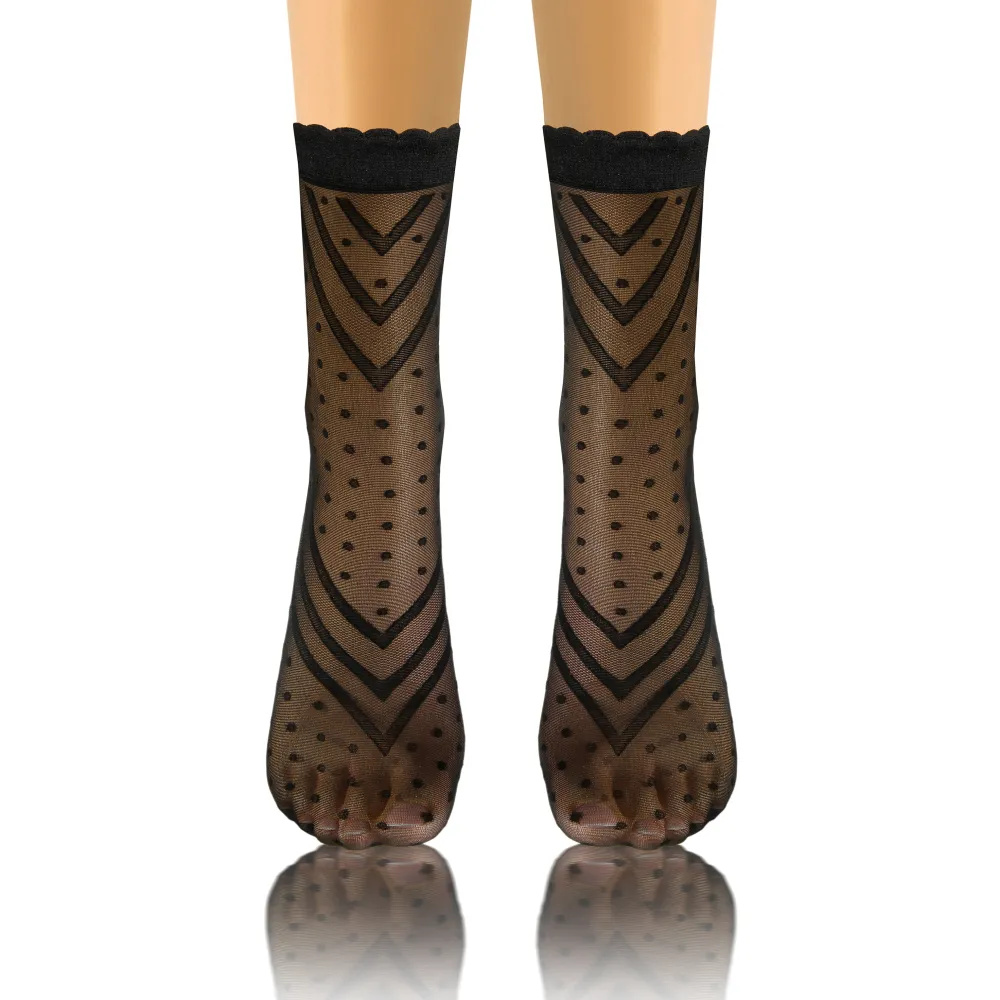 Изработена от деликатен, гъвкав материал. Прилепват идеално към крака, осигурявайки комфорт през целия ден. Прозрачният дизайн с фина шарка им придава уникален характер, а липсата на подсилвания на пръстите ги прави идеални за съчетаване с отворени обувки. Маншетът без натиск гарантира удобно носене без усещане за натиск.