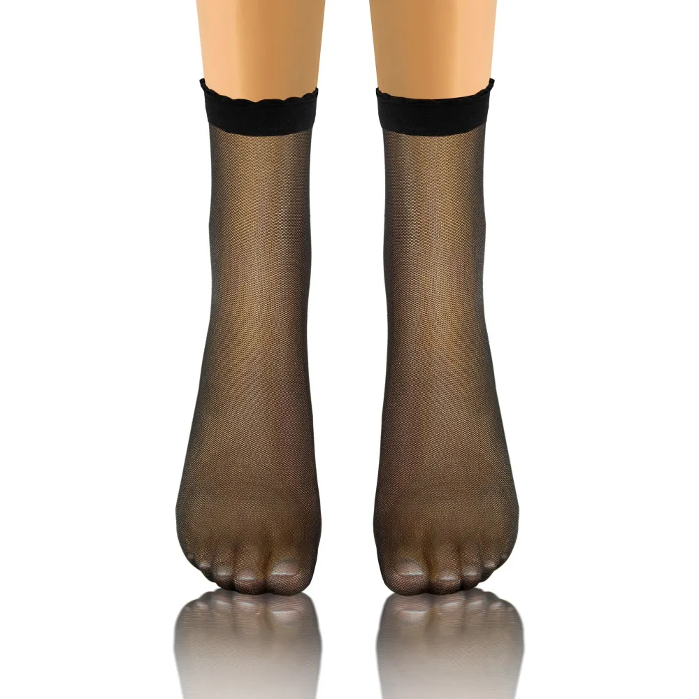Изработена от деликатен, гъвкав материал. Прилепват идеално към крака, осигурявайки комфорт през целия ден. Прозрачният дизайн с фина шарка им придава уникален характер, а липсата на подсилвания на пръстите ги прави идеални за съчетаване с отворени обувки. Маншетът без натиск гарантира удобно носене без усещане за натиск.