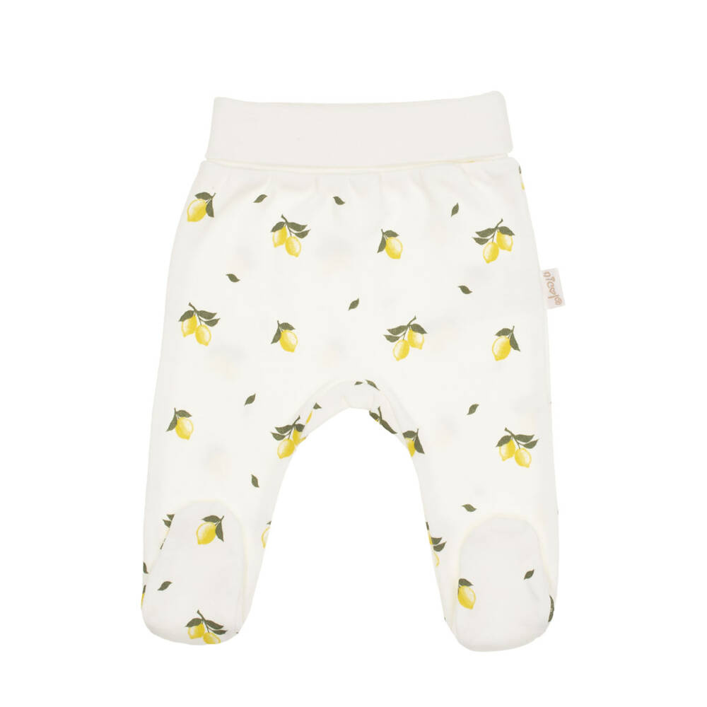 Удобни и меки спални костюми, изработени от 100% ефирен памук, кремав цвят с лимонени шарки. Високото качество на продукта е потвърдено от сертификата Oeko-Tex Standard 100 Trustworthy Textiles. Спалните костюми са със свободна кройка и леко спусната талия за поставяне на пелена и имат широка връзка без притискане на талията, осигуряваща пълен комфорт на бебето.