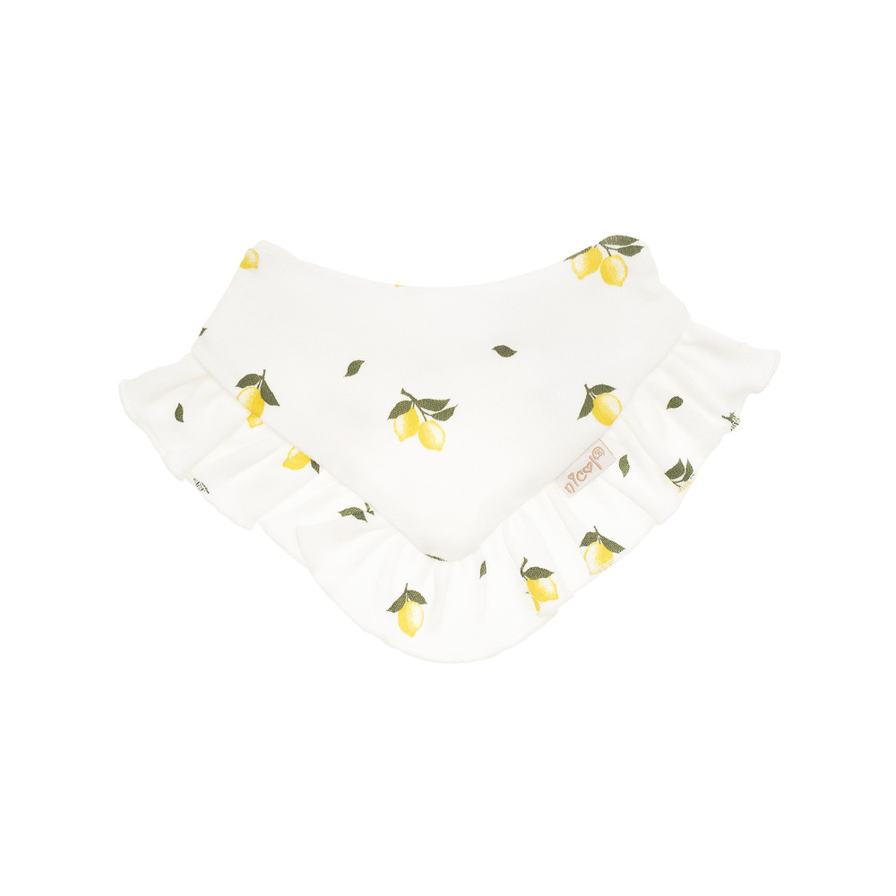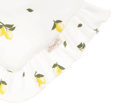 Шал за момиче, изработен в кремав цвят с лимонени шарки. Материята притежава сертификат Oeko-Tex Standard 100 Trustworthy Textiles. Продуктът се закопчава с безникелови копчета отзад. Воланът придава момичешки чар. Шалът е идеален за по-студените дни и ще има и декоративна функция.