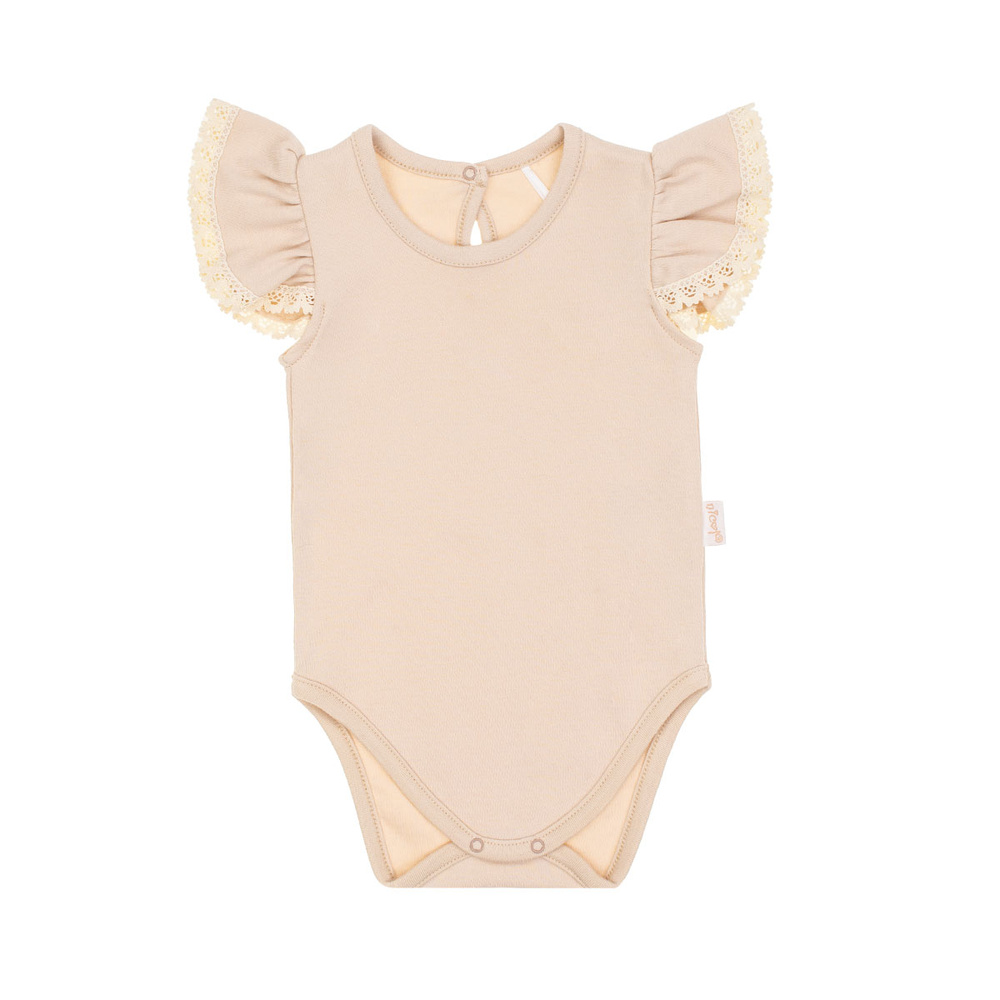 Боди с къс ръкав за момиче, изработено от памук. Материята притежава сертификат Oeko-Tex Standard 100 Trustworthy Textiles. Закопчава се с копчета без никел на гърба и в чатала.