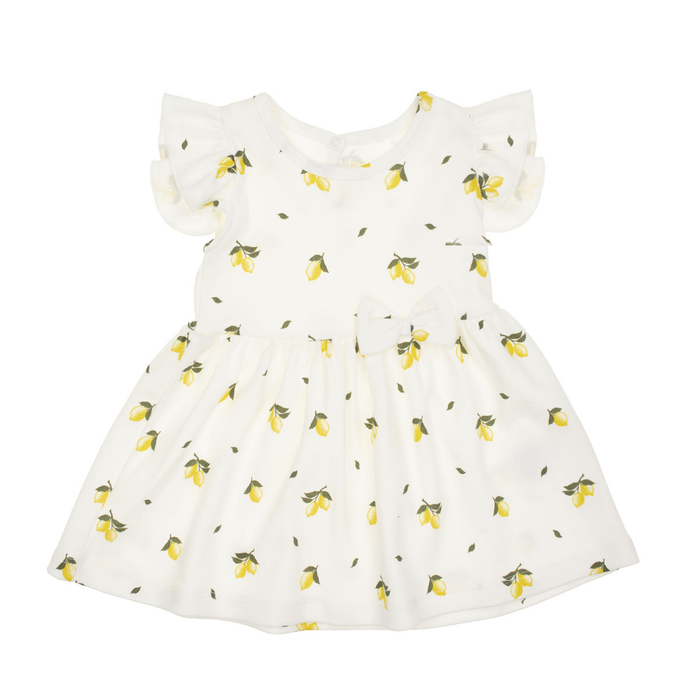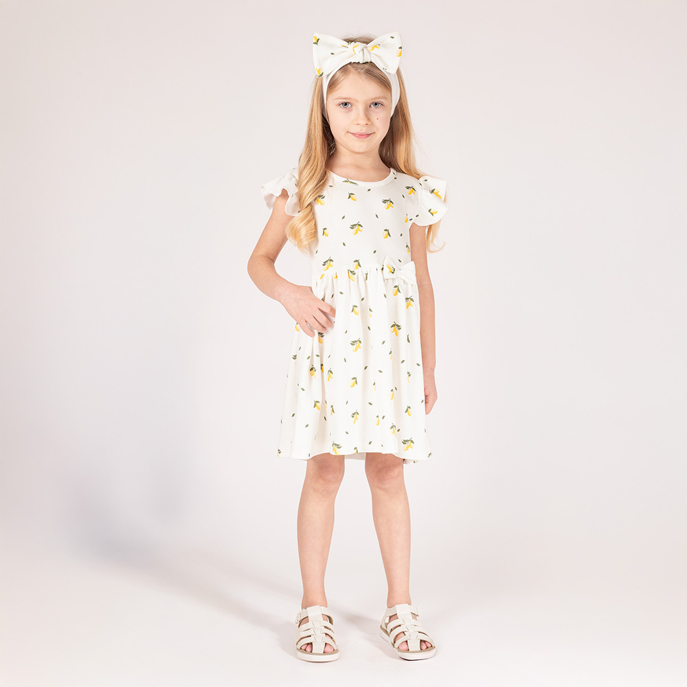 Запитване за продуктМодерна рокля с къс ръкав за момиче. Изработена от ефирен 100% бял памук с лимонена шарка. Капкообразно закопчаване на гърба. Материята е напълно безопасна за детската кожа. Дизайнът е декориран с волани, завършени с волан. Долната част на роклята е прибрана на линията на талията, а долната част на роклята е декорирана с волан. Роклята е удобна и ефирна. Продуктът е идеален за горещото лято.