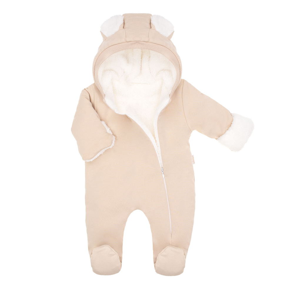 Изолирано наметало от бежов суичър памук с малко количество еластан. Подплатена е с бял косъм, което прави дрехата идеална за студените дни. Цялата е декорирана с качулка с ушички. Дрехата е с навити ръкави, за да предпази ръчичките на детето от студа на открито. Отпред има пришита облачна лепенка. Наметалото се закопчава с удобен цип - това ще улесни обличането. Материята е напълно безопасна за детската кожа.