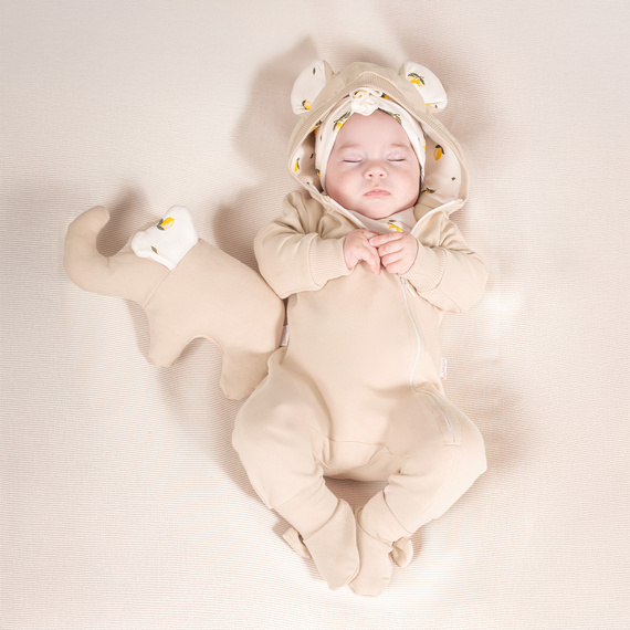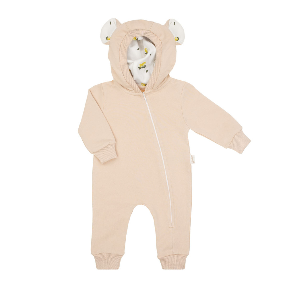 Анцуг клоун, изработен от памучен суичър в бежов цвят с малко количество еластан. Перфектен за количка или столче за кола. Има маншети на ръкавите, крачолите и качулка с ушички. Благодарение на това, че е изработено от сертифициран памук, вашето дете ще се чувства комфортно в него. Ромперът се закопчава с удобен цип - това ще улесни обличането на вашето бебе.