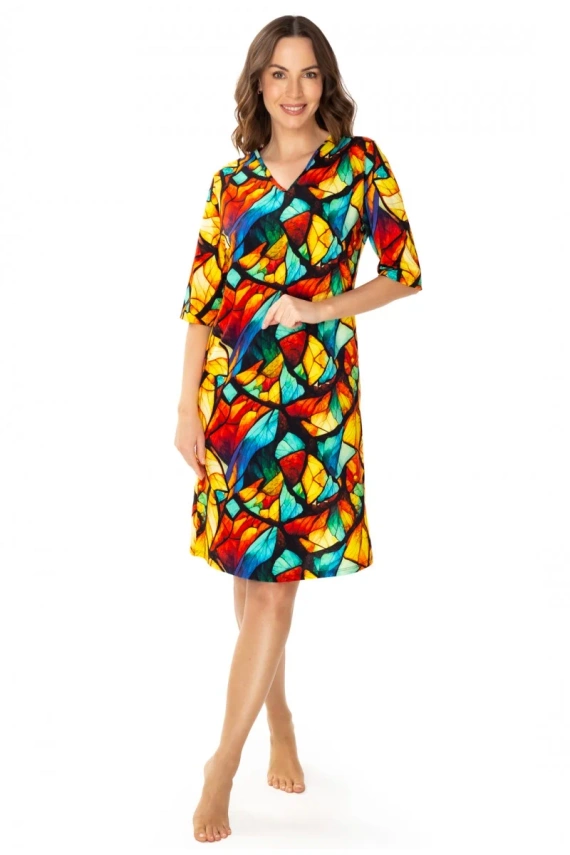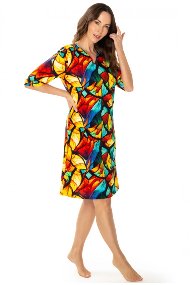 Стъкленият десен на ризата я отличава от класическите модели, а 3/4 ръкавът осигурява перфектно прилягане през всеки сезон. Ризата е изработена от висококачествен памук, който гарантира комфорт и удобство при сън. Той е идеален като елемент от нощен гардероб за жени, които ценят не само комфорта, но и уникалния дизайн. Памукът нежно обгръща тялото, позволявайки пълен релакс. Кройката позволява свобода на движенията, а V-образното деколте придава фина елегантност.