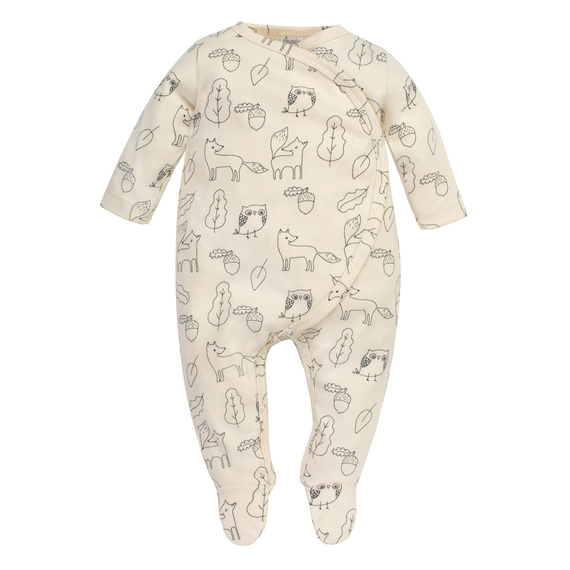 Запитване за продуктГащеризонът е изработен от нежна материя 100% памук в цвят екрю, декорирана с щампа. Разрезът на плика, напълно закопчан с безопасни щипки без съдържание на никел, прави обличането и преобличането на вашето бебе наистина лесно. Чаталът, зашит в чатала, прави дрехите да стоят добре на дете, носещо памперс. Гащеризонът е основен елемент от бельото за новородено. Произвежда се в Полша.