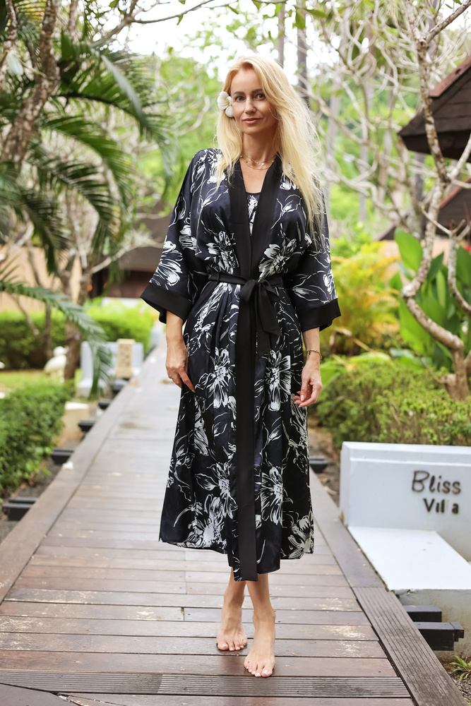 Отпусната форма с по-широки ръкави придава лекота и елегантност. Висококачествен шарен сатен. Коланът ви позволява да регулирате талията според желанието си. Можете да използвате хавлията и като връхна дреха за бански.