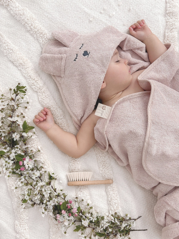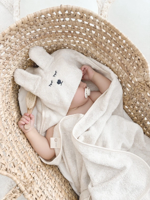 Кърпата има очарователна и много практична качулка с елегантна бродерия, която ще предпази вашето мъниче от изстиване след баня и ще изсуши нежно косата му.