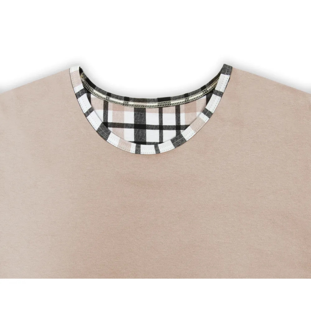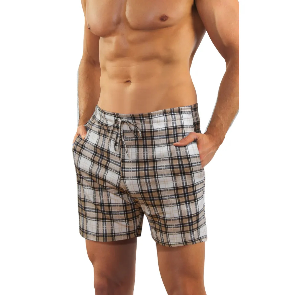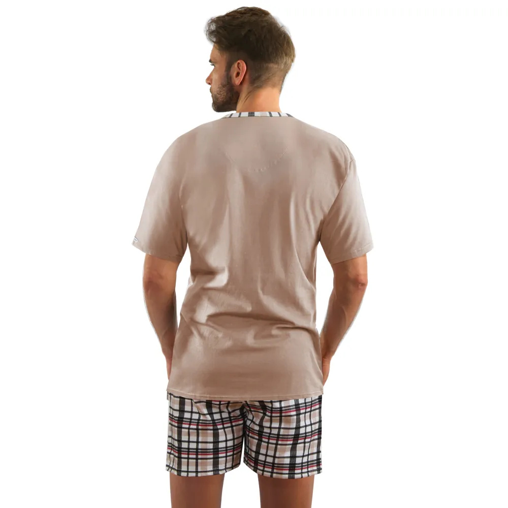 Мъжки пижами с къс ръкав и шорти са изработени от висококачествен памук. Тениска в модерен цвят "кафе с мляко" и шорти на каре. Късите панталони са с широк ластик на талията и се стягат допълнително с шнур. Късите панталони са с фланелка с две копчета и удобни джобове отстрани.