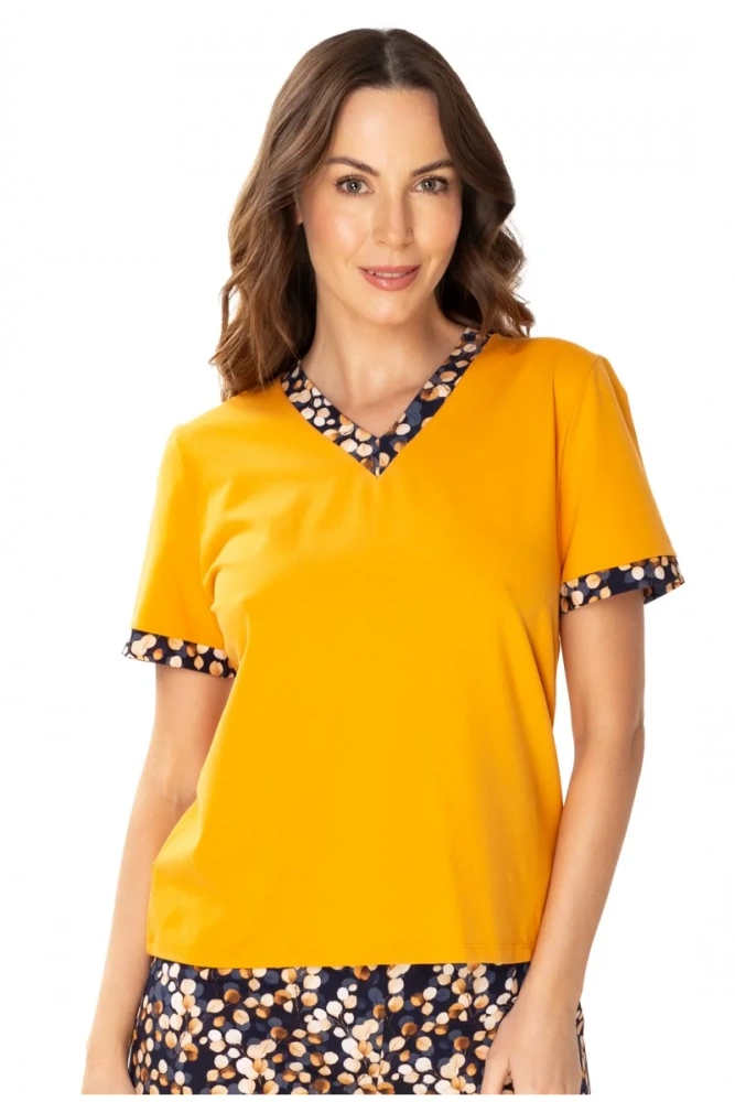 Идеално предложение за жени, които ценят комфорта, качеството и елегантността дори в уединението на дома си. Осигурява приятна мекота, дишане и отличен комфорт при носене. Тази материя позволява на кожата да диша, което прави блузата чудесен избор за всеки сезон. Този модел е с къси ръкави, които позволяват свобода на движение и класическо V-образно деколте, декорирано с контрастни кантове в елегантен десен.