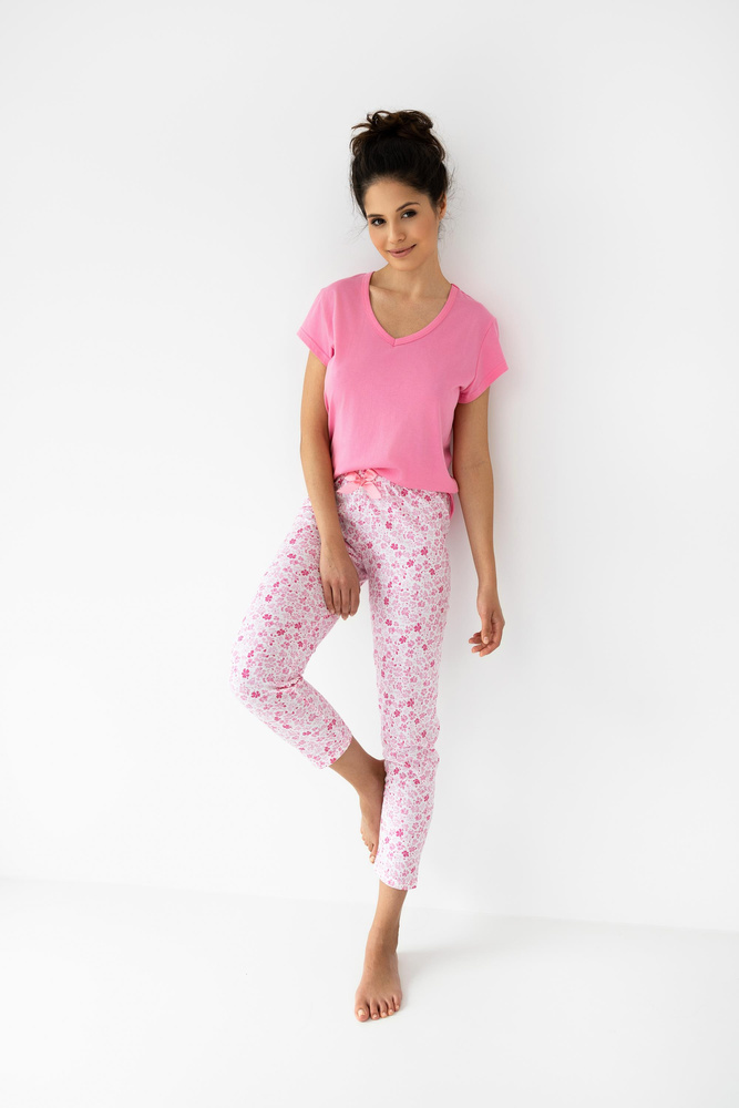 Дамска лятна пижама с флорален десен. Тениска с къс ръкав, V-образно деколте. В комплект с шарени панталони 7/8. Еластична талия и сатенена панделка.