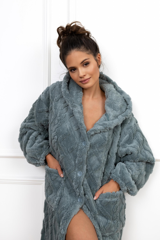 Дамски халат, изработен от приятна и мека трикотажна материя. Модел с дълъг ръкав и качулка. Функционални джобове на нивото на бедрата. Закопчани.