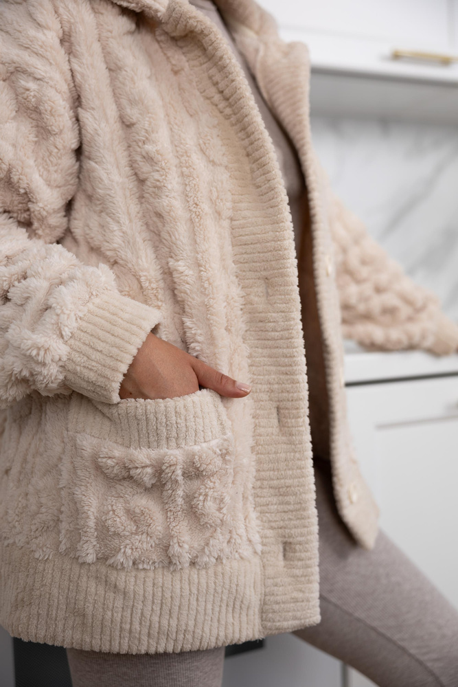 Удобен дамски халат за баня. Изработен от мека, пухкава мека плетка. Модел до средата на бедрото, права кройка с дълги ръкави. На нивото на бедрата има два джоба. Много удобна кройка, нежно прилепнала към тялото. Той ще се хареса на жените, които обичат мекотата и свободата.