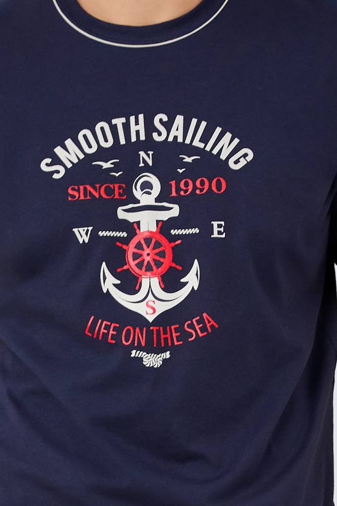 Мъжка къса пижама в морски стил от 100% памук. Отличава се със семпла и удобна кройка. Тениската с къс ръкав и кръгло деколте, обточено с кант, е украсена с принт на котва и стилен надпис, който подчертава характера ѝ. Комплектът се допълва от плътни къси панталони с джобове.