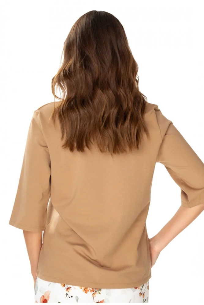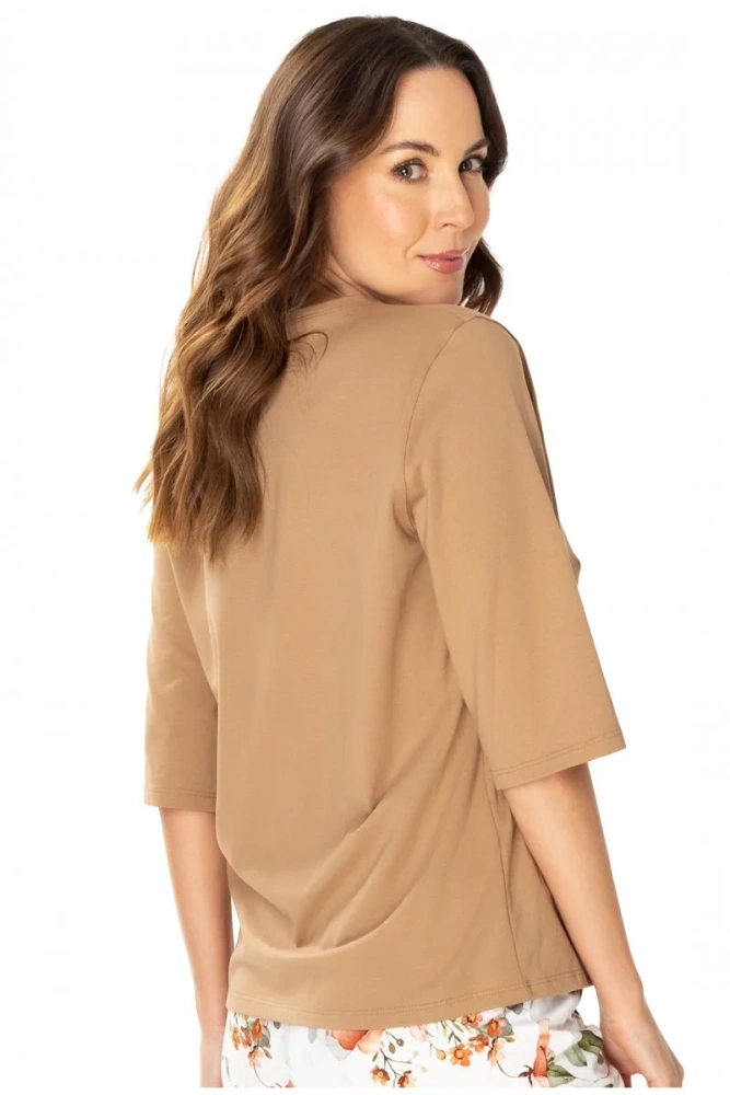 Идеално предложение за жени, които ценят комфорта, качеството и елегантността дори в уединението на дома си. Осигурява приятна мекота, дишане и отличен комфорт при носене. Тази материя позволява на кожата да диша, което прави блузата чудесен избор за всеки сезон. Благодарение на 3/4 ръкава, блузата ще стои добре както в по-студените, така и в по-топлите дни.