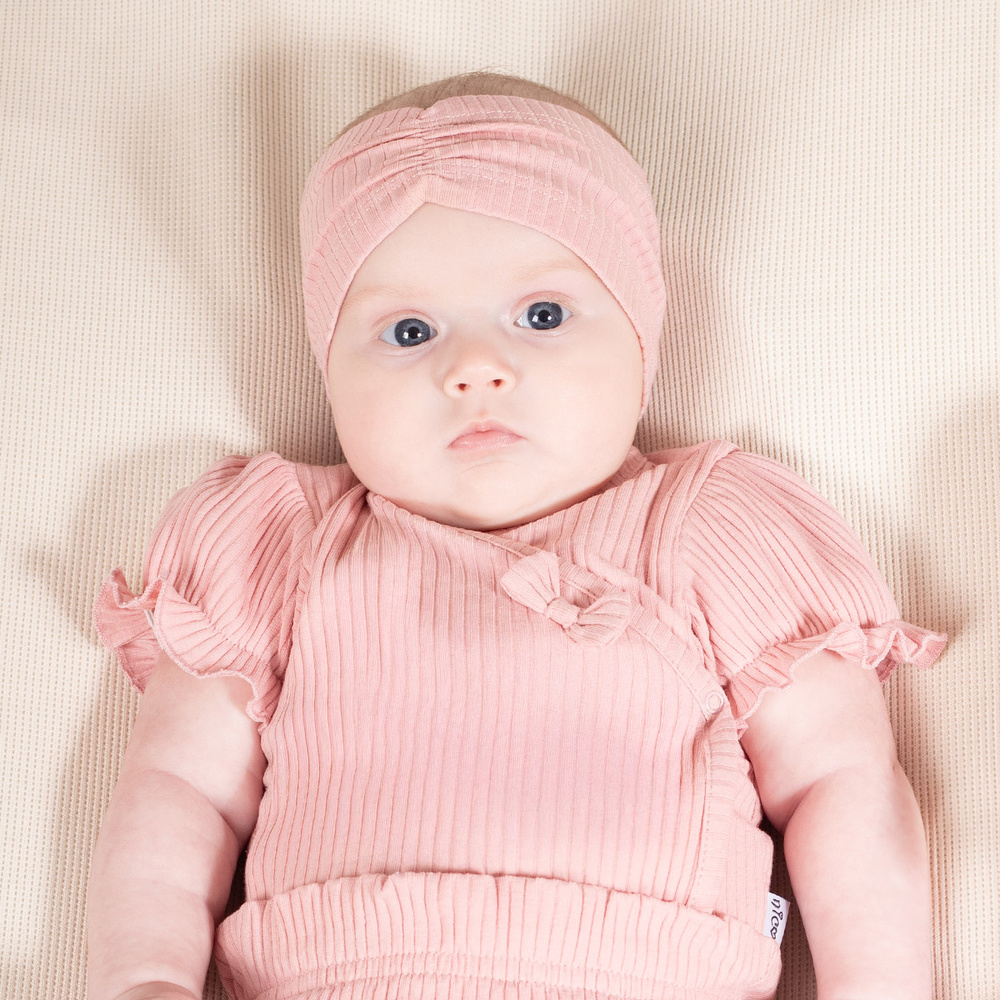 Запитване за продуктРозова лента за глава за момиче, изработена от рипсен памук с малко количество еластан. Дизайнът на тази лента за глава е по-широк, за да пасне добре на главата на детето. Декорирана е с волани по средата. Ще бъде чудесно допълнение към вашия стайлинг за различни поводи. Материята притежава сертификат Oeko-Tex Standard 100 Trustworthy Textiles.
