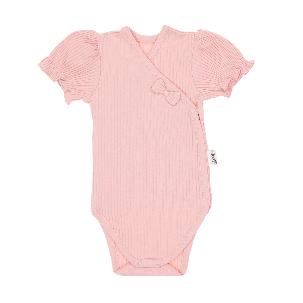 Боди плик с къс ръкав за момиче, изработено от памук. Материята притежава сертификат Oeko-Tex Standard 100 Trustworthy Textiles. Този модел се препоръчва за новородени, тъй като закопчалката плик улеснява обличането на бебето. Закопчава се с безникелови копчета отпред и в чатала.