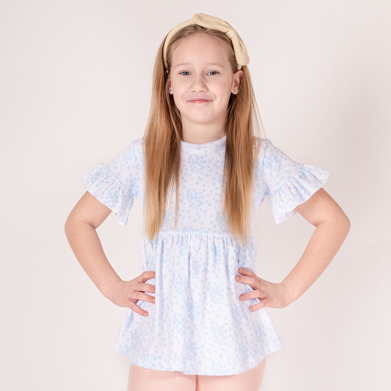 Запитване за продуктБлуза с къс ръкав за момиче. Перфектен за пролетта и лятото. Печатът е направен чрез безопасен метод за боядисване на водна основа. Моделът е декориран с волан в долната част и на раменете. На гърба има капкообразна закопчалка с тиксо без никел.