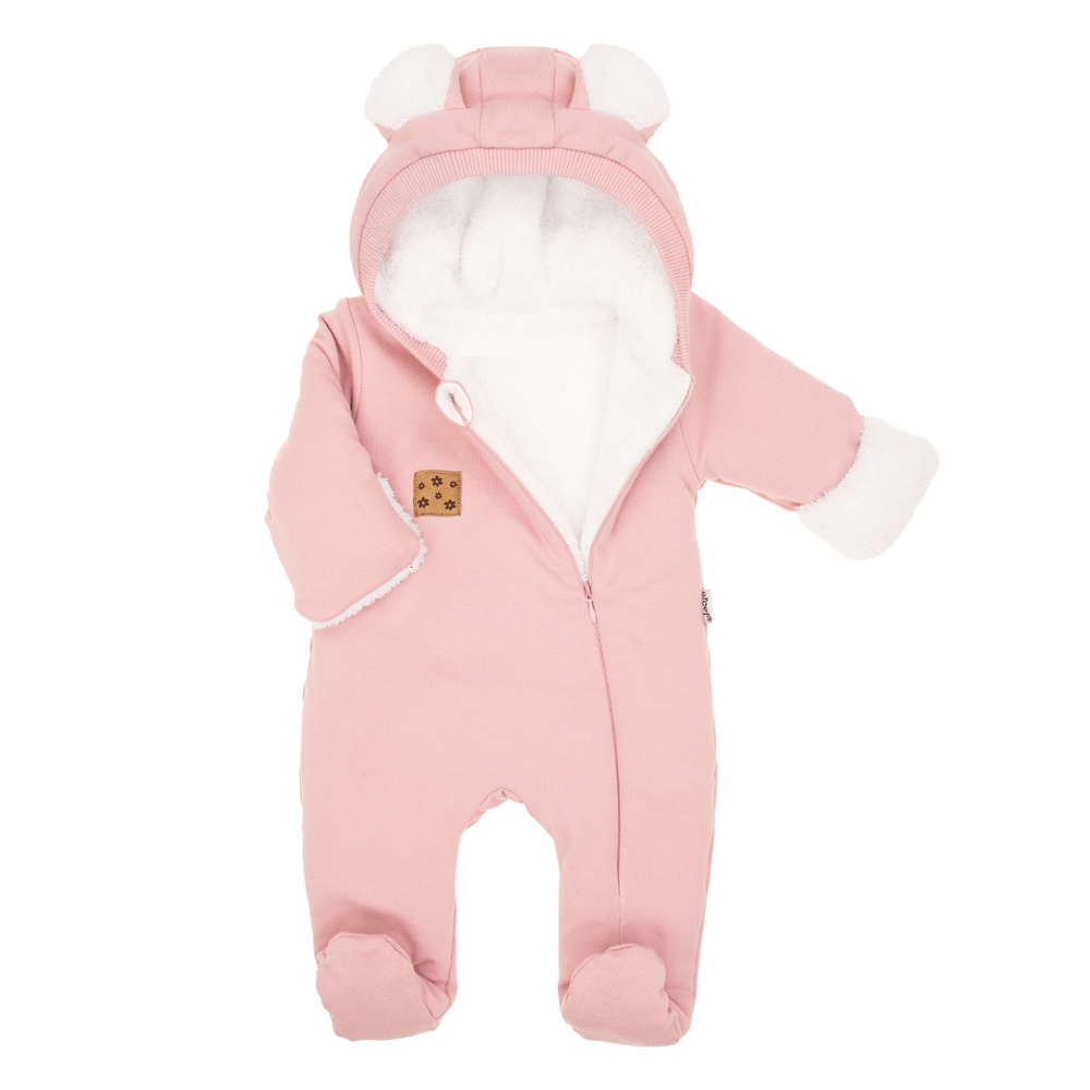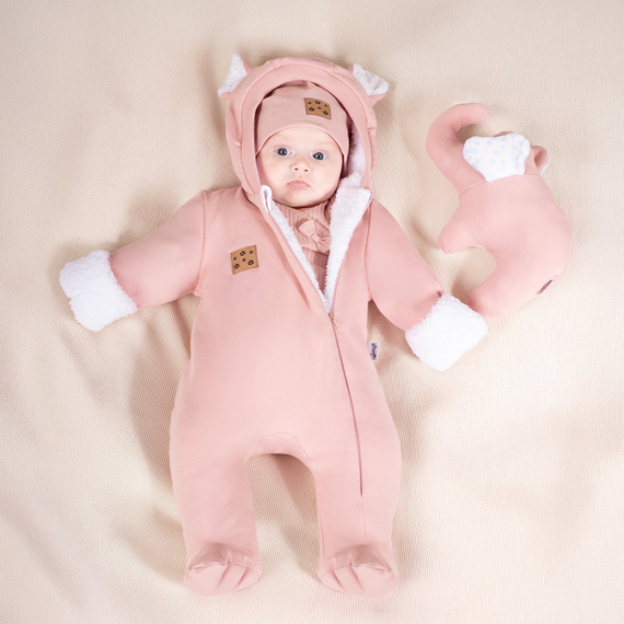 Изолирано наметало от розов суичър памук с малко количество еластан. Подплатена е с бял косъм, което прави дрехата идеална за студените дни. Цялата е декорирана с качулка с ушички. Дрехата е с навити ръкави, за да предпази ръчичките на детето от студа на открито. Отпред има пришита облачна лепенка. Наметалото се закопчава с удобен цип - това ще улесни обличането. Материята е напълно безопасна за детската кожа.