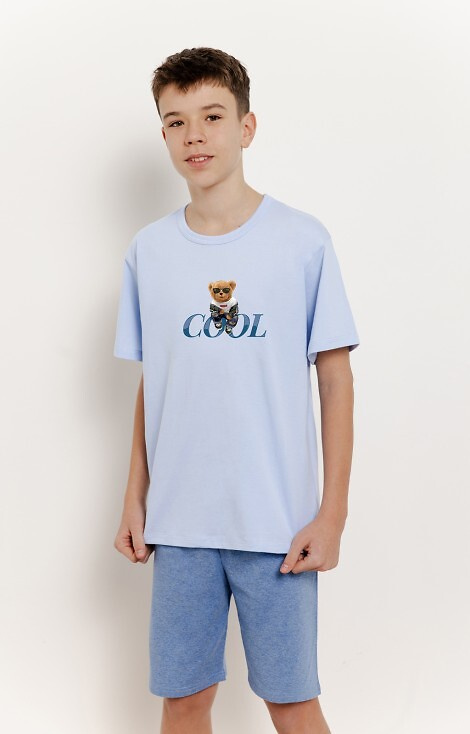Тениска с къс ръкав и щампа, обло деколте. Къси шорти.