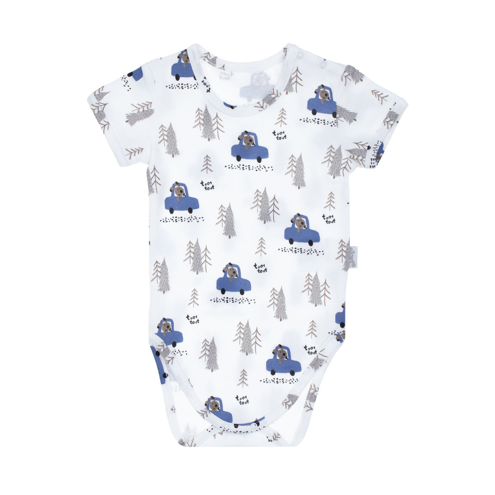 Запитване за продуктБоди с къс ръкав за момче, идеално за топлите дни, изработено от памук с щампа. Материята притежава сертификат Oeko-Tex Standard 100 Trustworthy Textiles. Дрехата се закопчава на рамото и чатала с копчета без никел, осигуряващи комфорт при обличане.