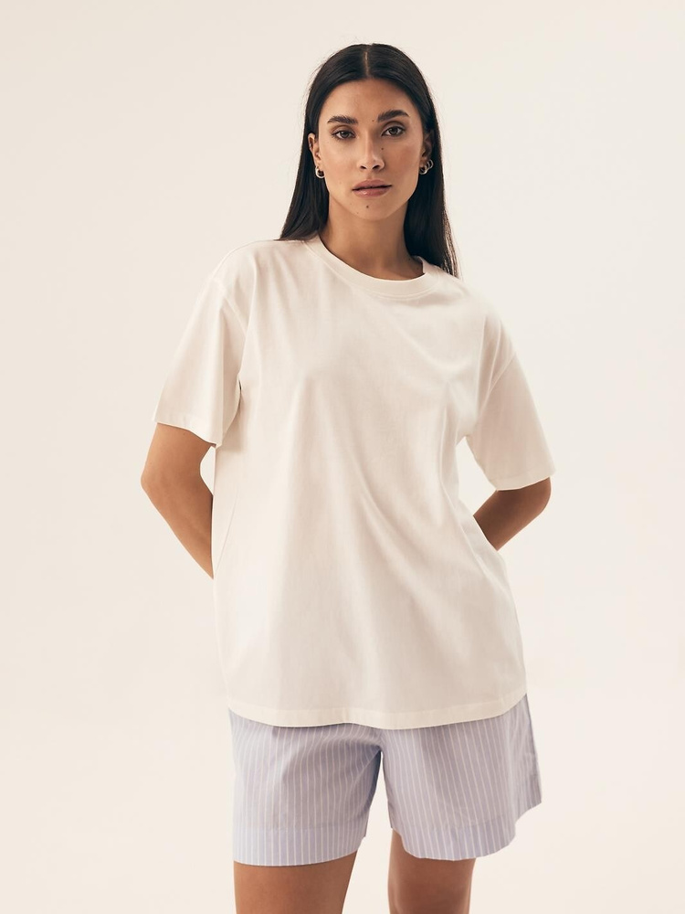 Комплектът включва къси панталонки от тънък раиран плат.