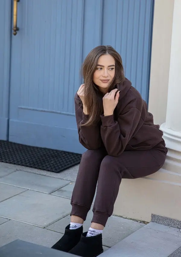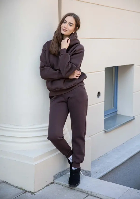 Суичър и панталон с връзки. Изработена от по-плътен памук. Удобни, вталени и гъвкави, те осигуряват пълна свобода на движение и удобство при носене всеки ден. Еластични маншети в долната част на крачолите не само придават характер, но и осигуряват идеално прилягане към всяка фигура и улесняват стоплянето в по-студените дни. Това е комбинация от отлично качество, комфорт и стил. Универсалността им ги прави идеален избор за различни поводи, идеални за разходка, пътуване и у дома.