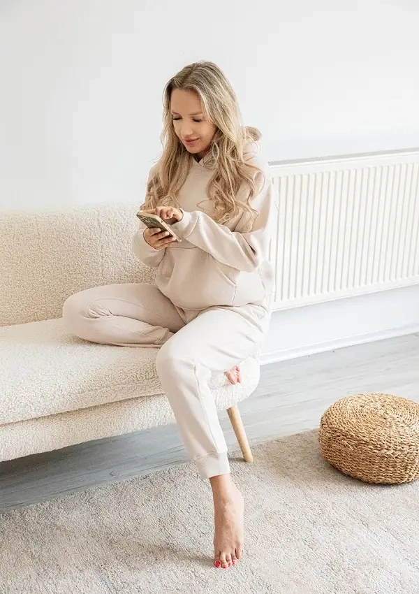 Суичър и панталон с връзки. Изработена от по-плътен памук. Удобни, вталени и гъвкави, те осигуряват пълна свобода на движение и удобство при носене всеки ден. Еластични маншети в долната част на крачолите не само придават характер, но и осигуряват идеално прилягане към всяка фигура и улесняват стоплянето в по-студените дни. Това е комбинация от отлично качество, комфорт и стил. Универсалността им ги прави идеален избор за различни поводи, идеални за разходка, пътуване и у дома.