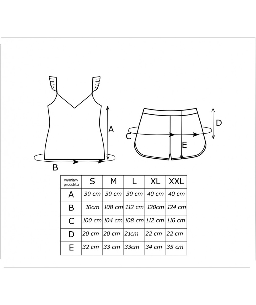 Дамска пижама от нежен памук. Тениска с тесни презрамки, завършена с волан. Съчетайте със свободни, удобни шорти.