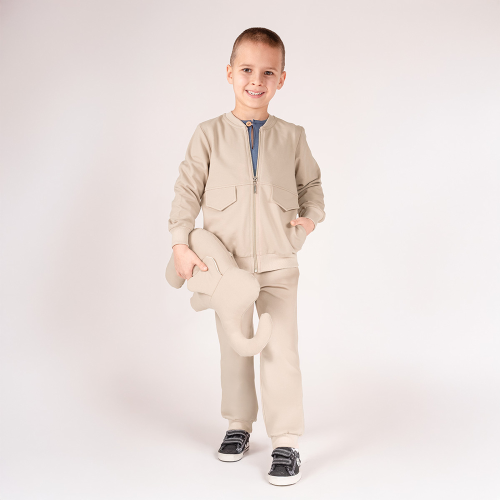 Спортен бумър суичър за момче, изработен от памучен суичър с малко количество еластан. Този стил е нашият бестселър. Стои страхотно на всяка фигура. В ръкавите, врата и талията има пришити маншети в цвета на модела. Закопчава се с цип. Материалът е сертифициран по Oeko-Tex Standard 100. Надежден текстил.