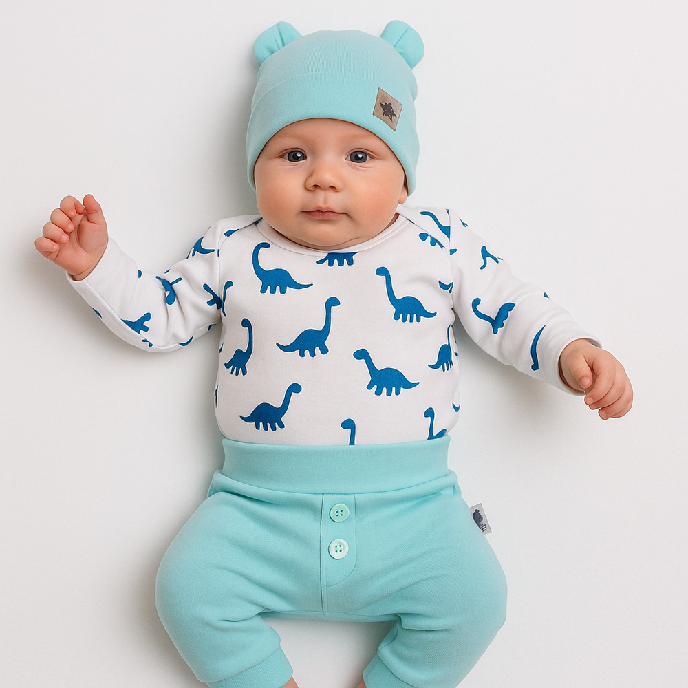 Комплект от 3 части за момче, състоящ се от панталонка в цвят мента, боди с дълъг ръкав, закопчаващо се на чатала с безникелови копчета от бял памук с мотив на динозавър и шапка с ушички. Продуктът притежава сертификат Oeko-Tex Standard 100 Trustworthy Textiles.