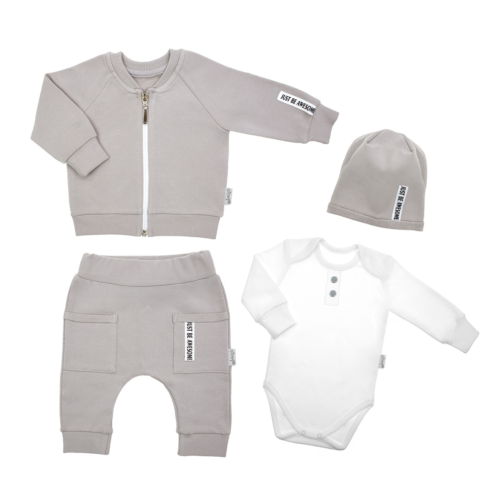 Запитване за продуктКомплект от 4 елемента: боди с дълъг ръкав, шапка, панталон и бомбър с цип. Комплектът е изработен от памучен суичър с еластан, сертифициран по Oeko-Tex Standard 100. Надежден текстил.