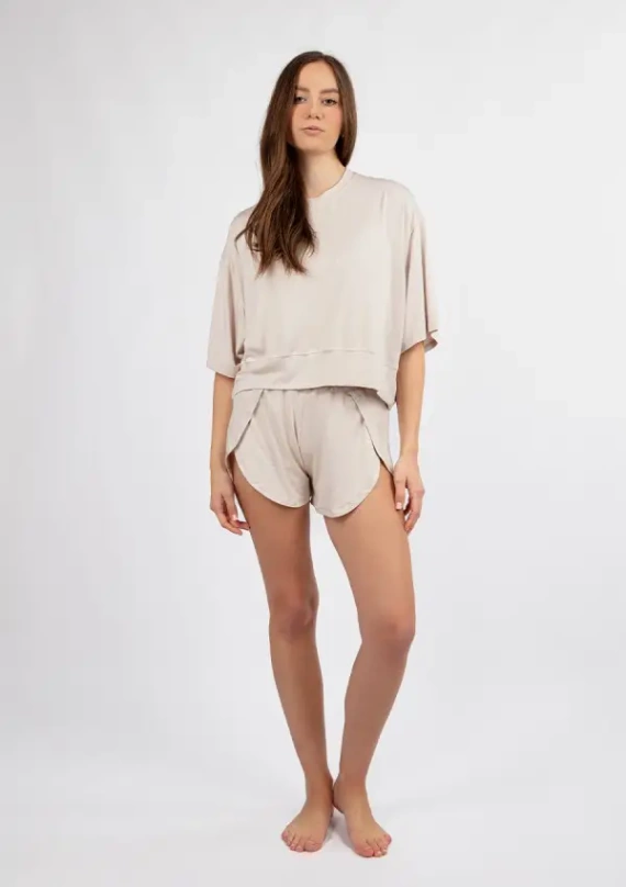 Състои се от два елемента: тениска със свободни, дълги до лактите ръкави и къси шорти с декоративни плисета. Блузата е с небрежна, леко oversized кройка, която фино прикрива несъвършенствата на фигурата и придава лекота на стайлинга. Дългите до лактите ръкави придават модерен характер на цялостната визия и правят тениската идеално съчетана с други дрехи.Шортиса създадени да подчертават женствените форми и същевременно да гарантират комфорт при носене. Плисетата им придават елегантен вид, а дължината им ги прави практични и удобни във всяка ситуация.
