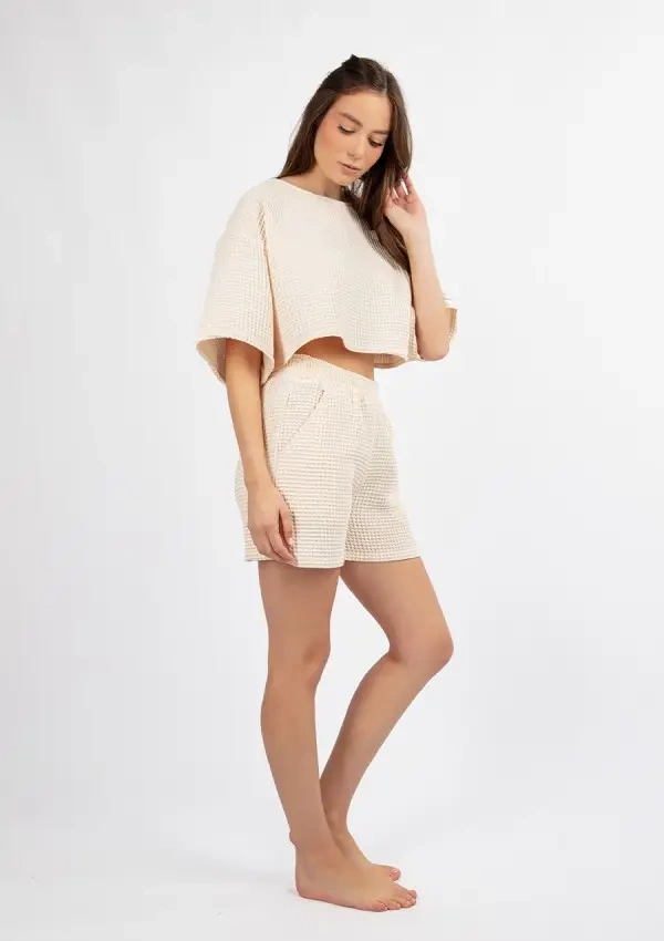 Комплект, състоящ се от шорти и скъсена тениска, произведени в Полша от висококачествен 100% вафлен памук, който е не само приятен на допир, но и ефирен и издръжлив. Кремавият нюанс на тъканта добавя финес към цялото - съчетавайки много стилове и аксесоари. Вафленият памук е уникален материал, придобил популярност благодарение на своята структура и функционални свойства. Освен това материята не е прозрачна.Благодарение на деликатната си тъкан, тази материя осигурява страхотна вентилация, което я прави идеална за лятото.