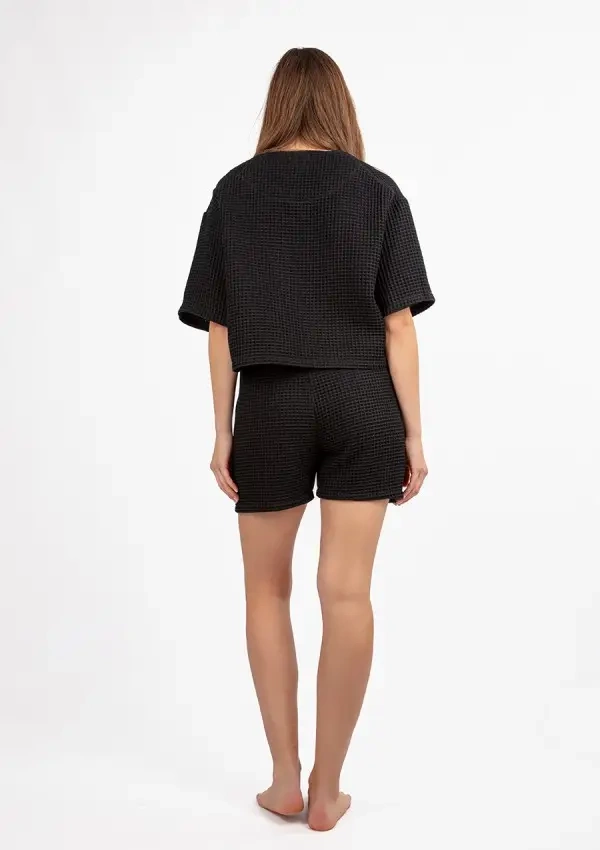 Комплект, състоящ се от шорти и скъсена тениска, произведени в Полша от висококачествен 100% вафлен памук, който е не само приятен на допир, но и ефирен и издръжлив. Кремавият нюанс на тъканта добавя финес към цялото - съчетавайки много стилове и аксесоари. Вафленият памук е уникален материал, придобил популярност благодарение на своята структура и функционални свойства. Освен това материята не е прозрачна.Благодарение на деликатната си тъкан, тази материя осигурява страхотна вентилация, което я прави идеална за лятото.