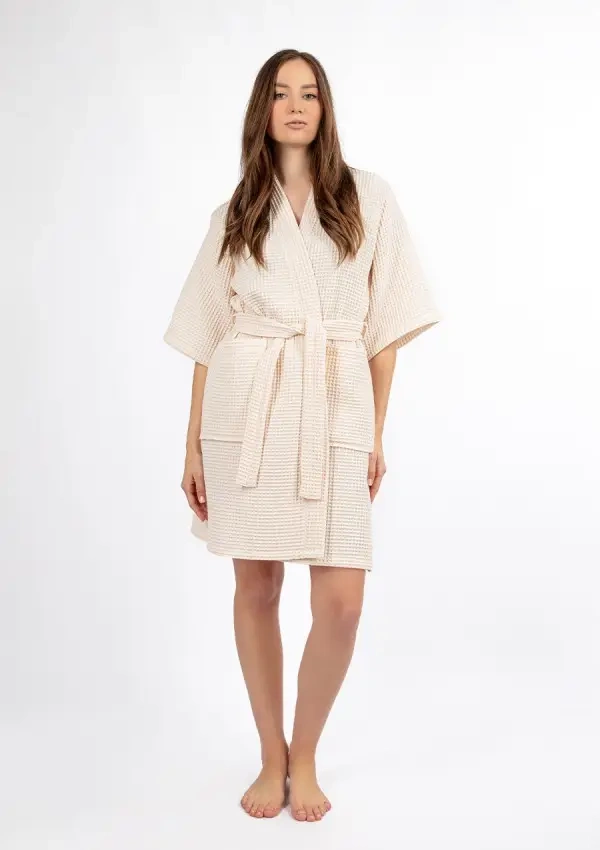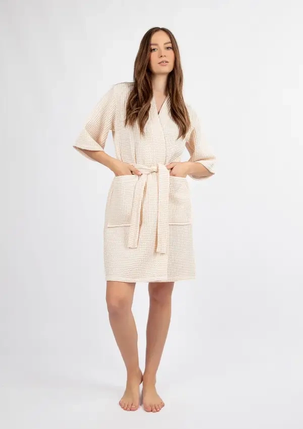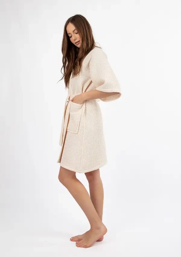 Този къс летен дамски халат е идеален избор за по-топлите дни - той е лек, ефирен и изглежда изключително стилен. Важното е, че нашите домашни палти се шият в Полша, с внимание към детайла и качество на изработка. Халатът е изработен от уникална вафлена материя - 100% памук, която е приятна за кожата, дишаща и идеална за домашна употреба. Вафлената структура му придава интересна визия, но също така влияе върху удобството при носене - материята не залепва по тялото и дава усещане за свежест дори в горещите дни.