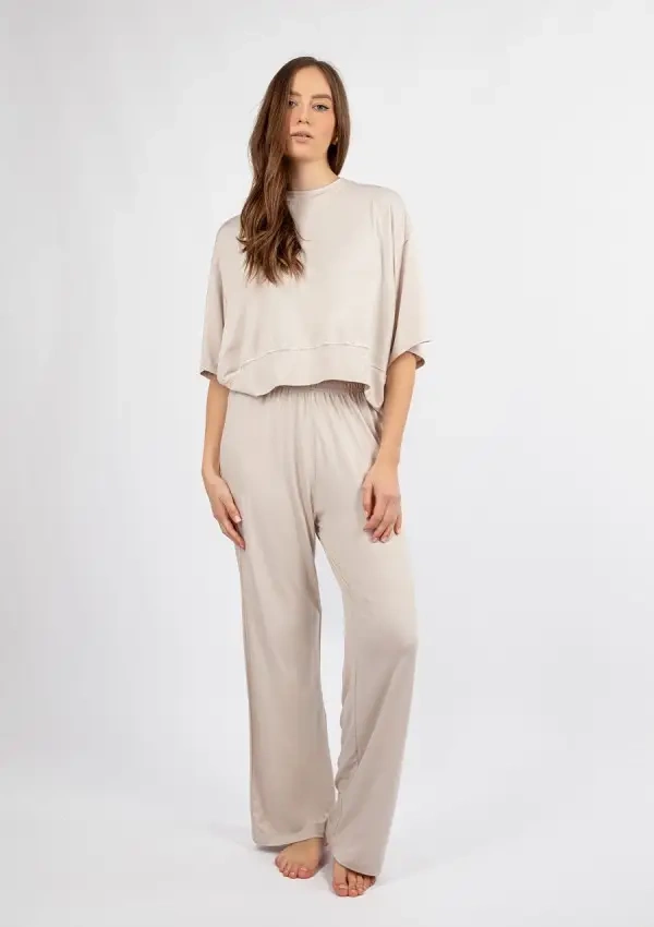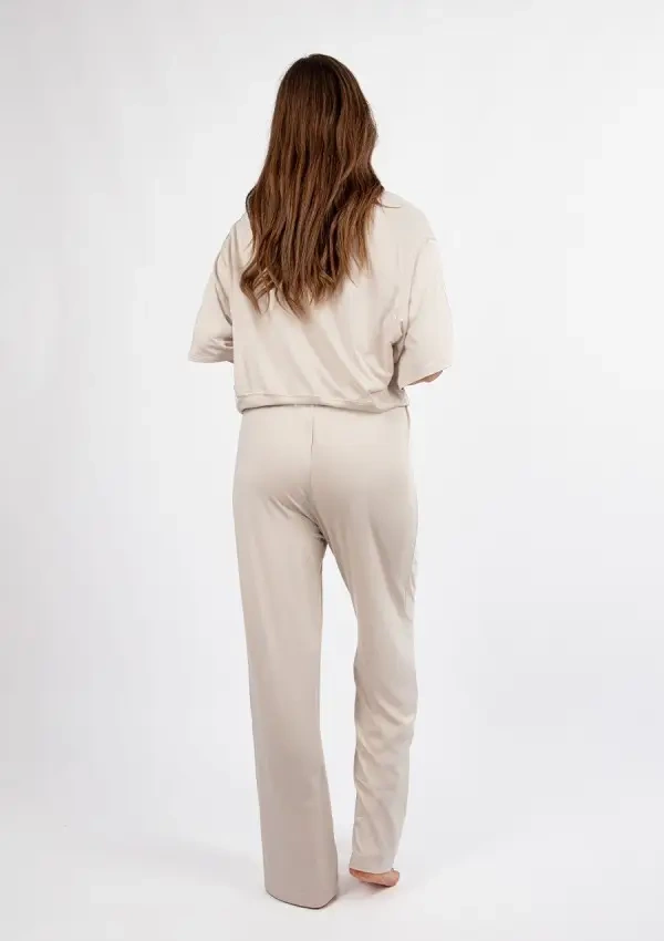Комплект е комбинация от комфорт, естествени материи и фина елегантност. Едно от най-големите предимства е неговият материал. Бамбуковата тъкан е изключително мек, дишащ и щадящ кожата материал, който е перфектен за всеки сезон. Плавната структура на материята прави дрехите да стоят красиво на фигурата, като не ограничават движенията и осигуряват максимална свобода. Бамбуковата тъкан също е естествено хипоалергенна и антибактериална, което я прави идеална за хора с чувствителна кожа.