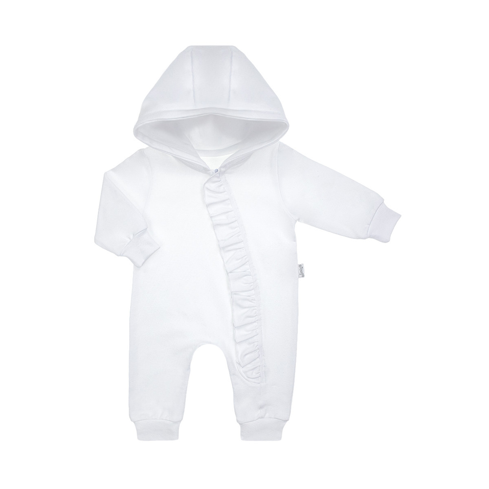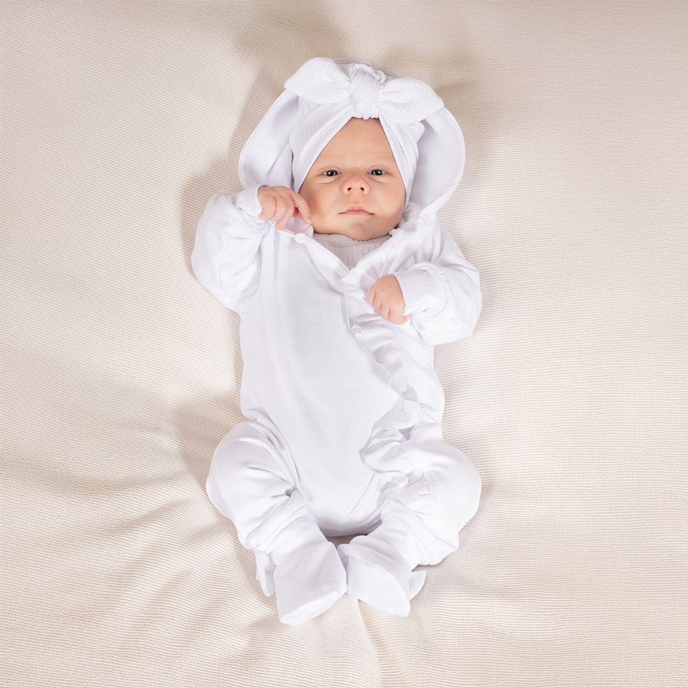 Анцуг за момиче, изработен от памучен суичър с малко количество еластан. Перфектен за количка или столче за кола. Има маншети на ръкавите, крачолите и качулка с ушички.  Благодарение на това, че е изработено от сертифициран памук, вашето дете ще се чувства комфортно в него. Ромперът се закопчава с удобен цип - това ще улесни обличането на вашето бебе.