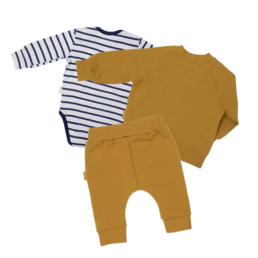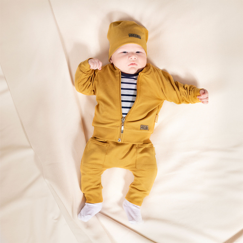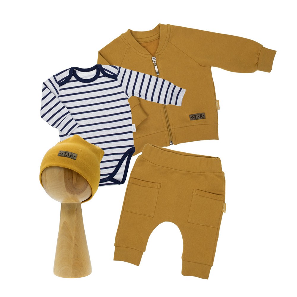 Комплект от 4 елемента: боди с дълъг ръкав, шапка, панталон и бомбър с цип. Комплектът е изработен от памучен суичър с еластан, сертифициран по Oeko-Tex Standard 100. Надежден текстил.