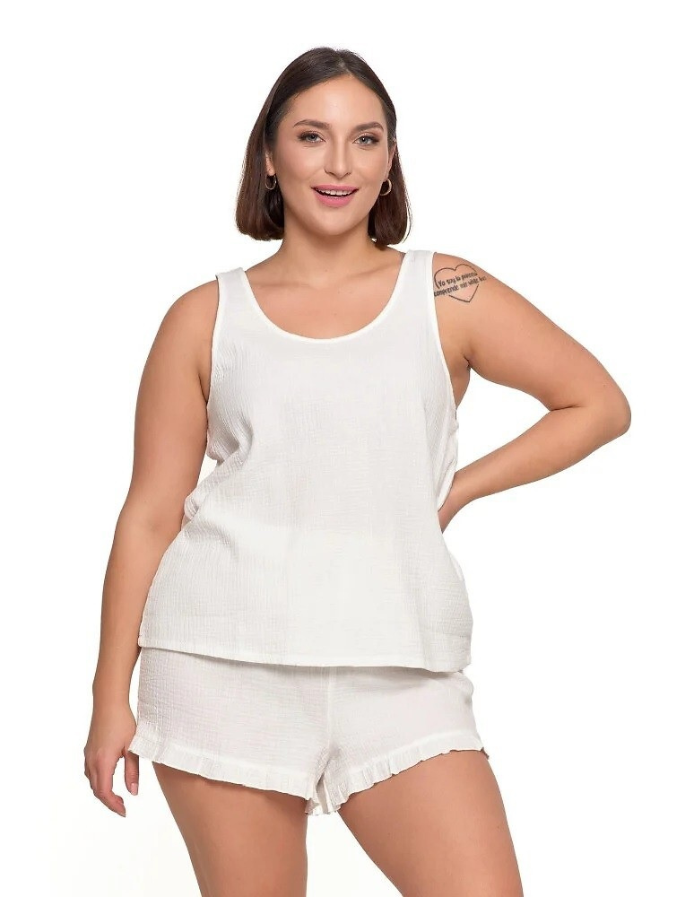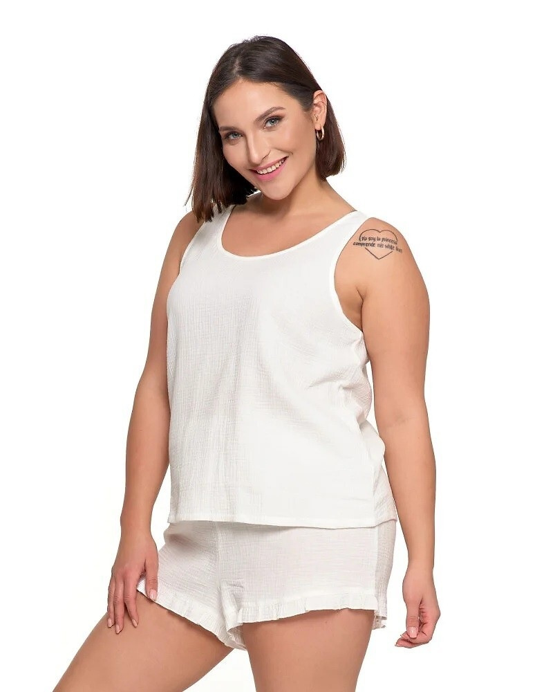 Дамска пижама от две части с широки презрамки и къси панталонки е идеално предложение за жени, които ценят удобството и комфорта по време на сън. Изработен от лек, ефирен муселин, той гарантира усещане за лекота и свобода на движение през цялата нощ. Свободни шорти с ластик на талията, завършени с волан