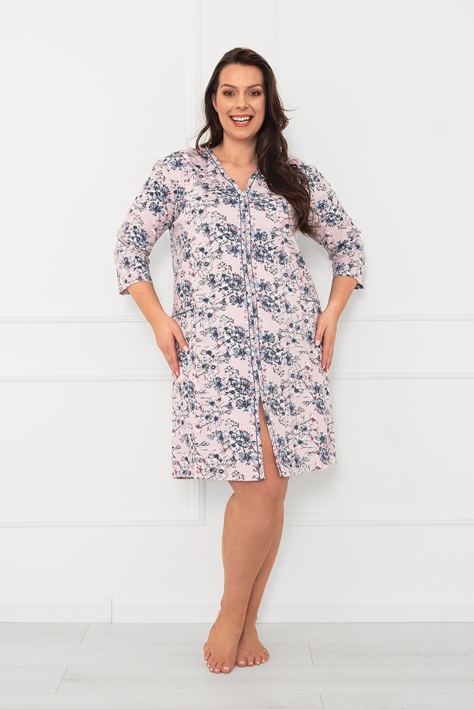 Това дамско палто е идеалният избор за тези, които ценят комфорта и стила у дома. С цип и V-образно деколте, завършено с контрастен кант, той съчетава функционалност с изтънчен дизайн. 3/4 ръкавът осигурява комфорт през всички сезони, а дължината до коляното гарантира пълна свобода на движенията. В предната част има практични джобове, които допринасят за функционалността му. Изработен от памучен трикотаж с флорален десен в пастелни нюанси. Предлага се в размери от M до XXXL.