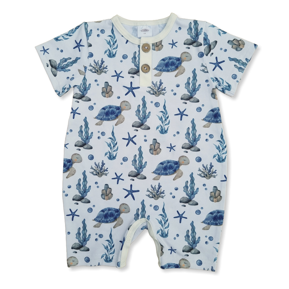 Памучен гащеризон с крачоли. Възможността за разкопчаване на рампера в чатала и на лявото рамо прави обличането и преобличането на бебето много по-лесно. Резетата са изработени от антиалергичен материал без съдържание на никел. Рамперите са основен елемент от летния гардероб на вашето бебе. Перфектен за ваканционни пътувания и пролетни и летни разходки.