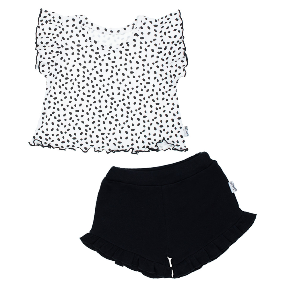 Запитване за продуктЛетен комплект за момиче. Блуза с къс ръкав, ръкави с волани. Къси шорти, изработени от 100% памук, напълно безопасни за деца. Имат ластик на талията, който не притиска корема. Долната част на крачолите е декорирана с волан.