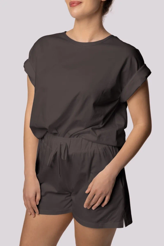 Дамска пижама от мека, дишаща материя. Класическа тениска с права кройка с къси ръкави и модерни странични цепки осигурява свобода на движение и комфорт при носене. Комплектът включва удобни шорти с широк ластик, регулируем шнур. Практични джобове отстрани. Цепките на крачолите придават финес на цялата визия.