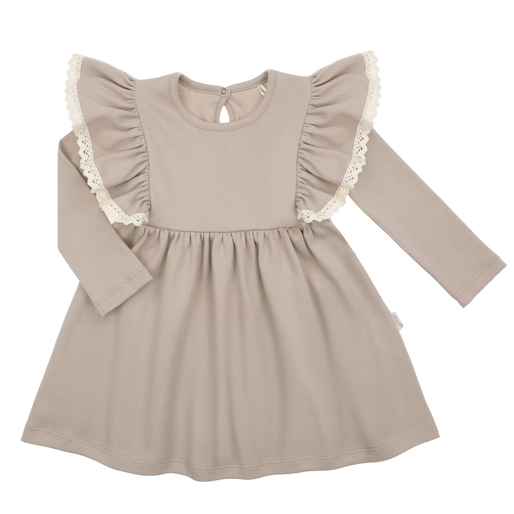 Моделът е с дълги ръкави и фин волан по раменете, декориран с дантелена гарнитура, която придава момичешки чар и деликатен ретро характер на роклята. Копче отзад улеснява обуването.