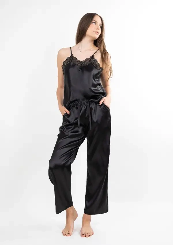 • Черно горнище с регулируеми презрамки и дълги широки панталони с удобен ластик на талията. Лек, ефирен сатен нежно обгръща тялото, осигурявайки комфорт и чувствен вид.