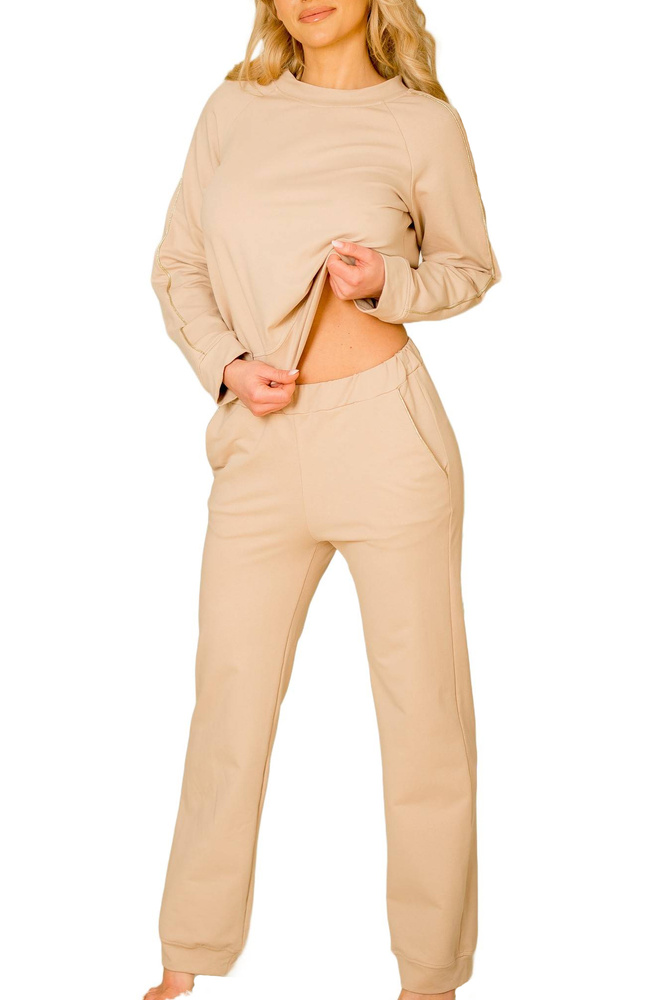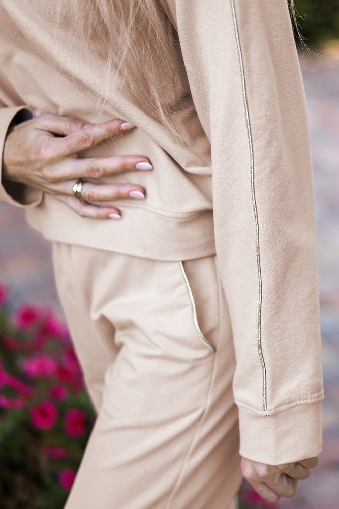 Комплектът се състои от суичър с класическа кройка и панталон с удобен колан и джобове. Ефектните декорации под формата на нежни, блестящи шевове на ръкавите и джобовете придават уникален характер на анцуга.