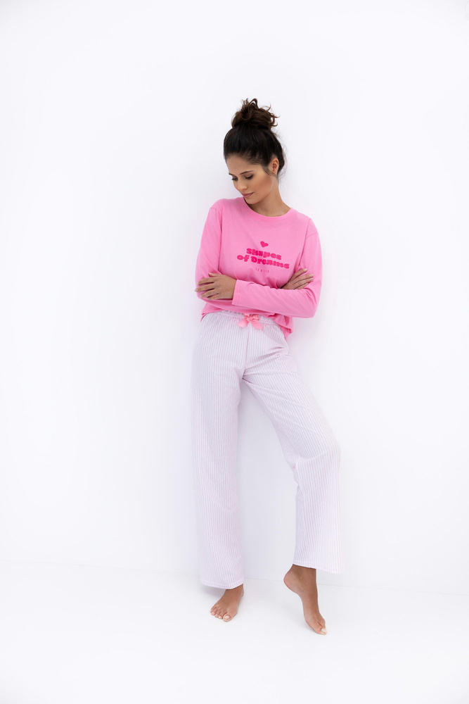 • Памучна пижама Malaya Sensis – тениска с къс ръкав и декоративен надпис, дълъг панталон с ластик на талията и панделка. Комфорт и стил всяка вечер.
